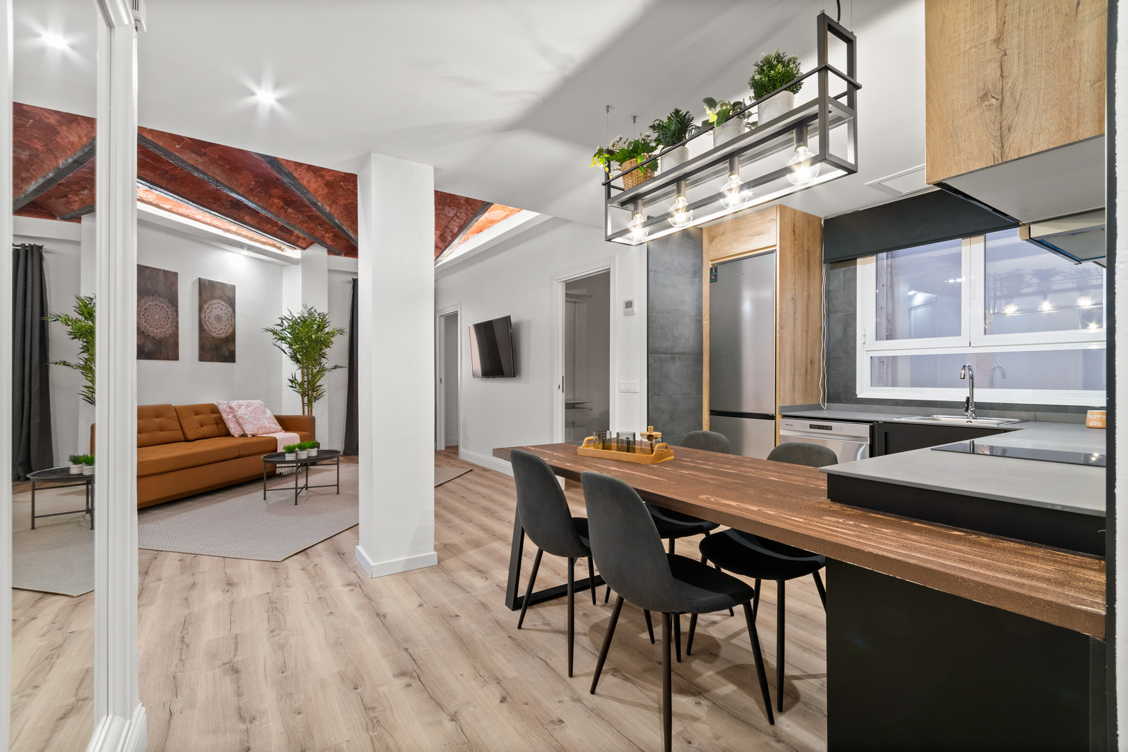 Apartamento moderno y elegante con una acogedora sala de estar y una cocina abierta. El techo de ladrillo visto aporta carácter al espacio, mientras que el suelo de madera aporta calidez. La cocina cuenta con elegantes encimeras negras y electrodomésticos modernos. El salón está amueblado con un cómodo sofá y un televisor, perfecto para relajarse después de un día explorando Barcelona. El apartamento también cuenta con dos dormitorios y un baño con ducha, por lo que es ideal para un grupo pequeño o una familia que busca una estancia cómoda en la ciudad. En general, el diseño es contemporáneo y acogedor, y ofrece un ambiente acogedor para los huéspedes.