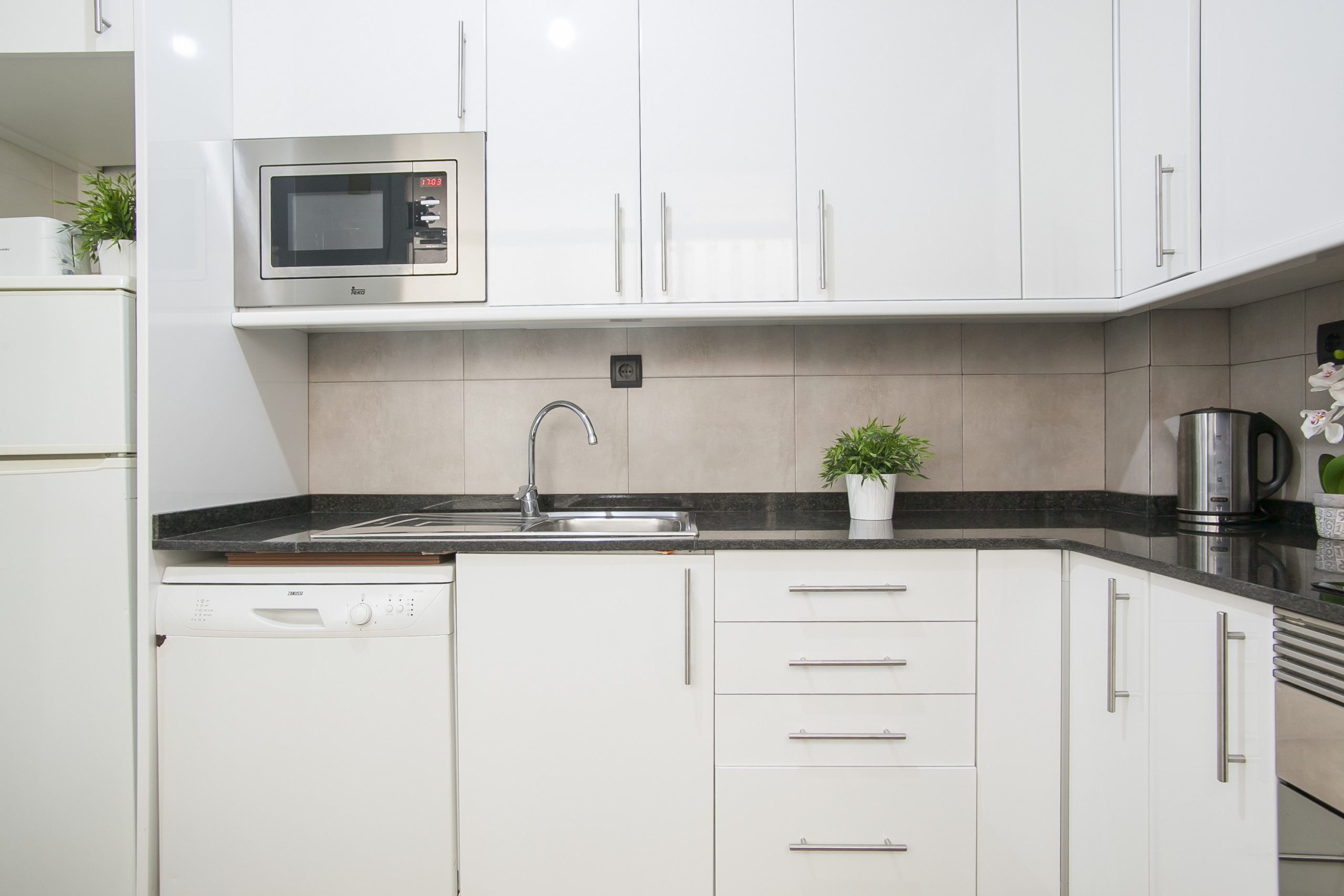 La cocina es amplia y está totalmente equipada con lavavajillas, microondas, horno, placa vitrocerámica, nevera, cafetera Nespresso y tostadora. A disposición del huésped hay también plancha y mesa de planchar, tendedero, secador de pelo, ropa de cama y toallas para cada huésped. Los suelos son de parquet, hay aire acondicionado/calefacción e internet WIFI gratuito.