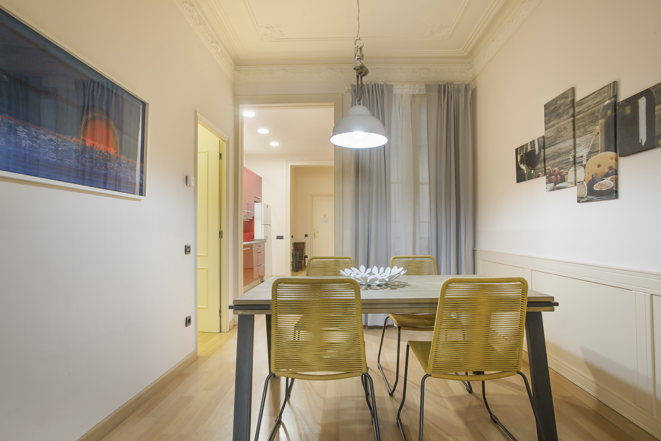 Completamente renovado y muy luminoso, el apartamento está ubicado en un antiguo edificio del barrio del Eixample a pocos pasos del famoso Passeig de Gracia. La entrada al edificio tiene algunos escalones antes de llegar al ascensor. El apartamento está situado en la parte interior del edificio, por lo que es muy tranquilo para el descanso y gracias a sus amplios ventanales ofrece luz solar durante todo el día.